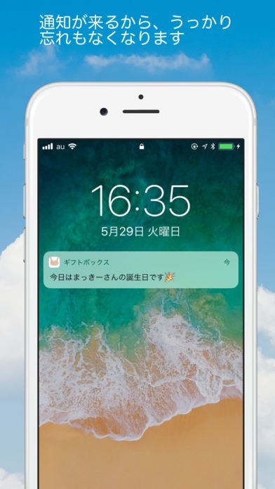 App Storeより引用ギフトボックスは貴方の大切な人の誕生日・記念日をわかりやすく管理して、期日が近づいたら通知でお知らせします。