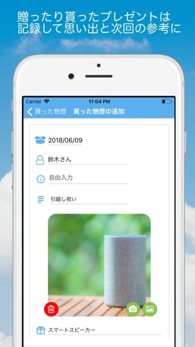 また、贈ったもの・貰ったものプレゼントもコメントと写真で記録することができます。。