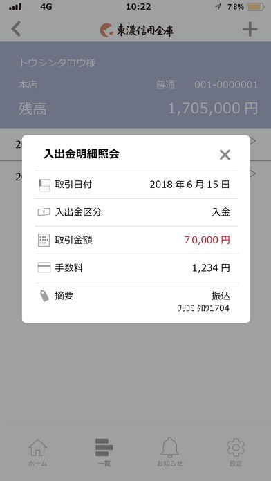 アプリで登録した当金庫の普通預金口座(総合口座、貯蓄預金口座、カードローン口座を含む)の残高照会・入出金明細照会が簡単操作でいつでもどこでもご利用いただけます。