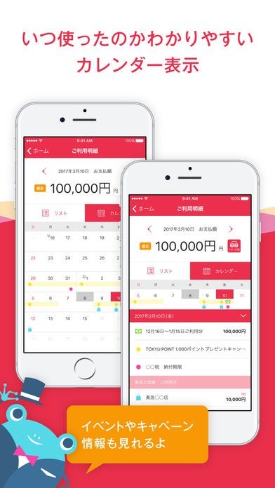 カレンダー形式で日にちを選んで日ごとの利用明細を確認することができます。イベント開催日や引き落とし日もカレンダー上にアイコンで表示されているので忘れずに済みます。