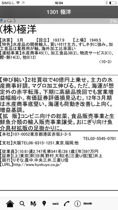 アプリには上場企業の業績、財務内容、株価などが掲載されています。豊富なコンテンツを読めば、企業の現状を把握することができるでしょう。色んな上場企業の特色を調べれば、株式投資にも活かせるはずです。
