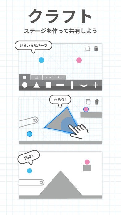 『Brain Dots(ブレインドッツ)』は累計ダウンロード数が3000万回を突破した大人気の柔軟な発想を引き出してくれるパズルゲームアプリです。ステージをクリアするためのルールはとってもシンプルになっていて、画面に表示されている二つのボールをぶつけるだけですが、そのためには画面に指で自由に図形や線を描く必要があるので柔軟な発想が必要になります。ステージクリアの瞬間を動画や静止画で記録してシェアすることが出来るので友達や家族と盛り上がることができます。