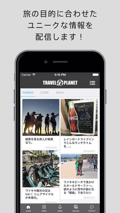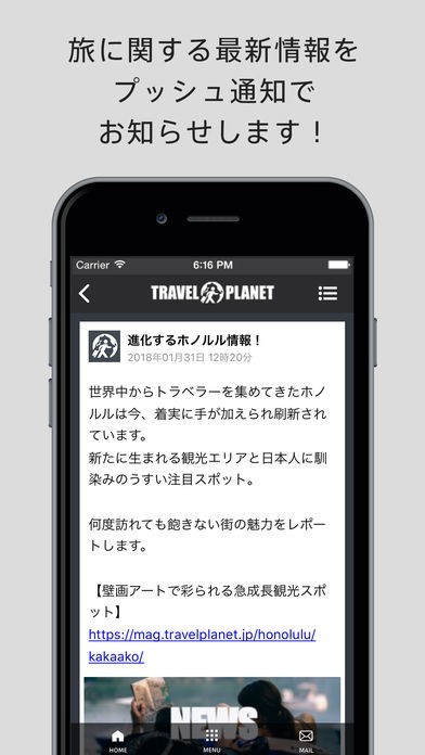 旅に出かけるためには思わず体が動き出してしまうような新しい情報を手に入れることが肝要です。アプリに新しい情報が追加されるたびにプッシュ通知で知らせてくれる機能が用意されています。