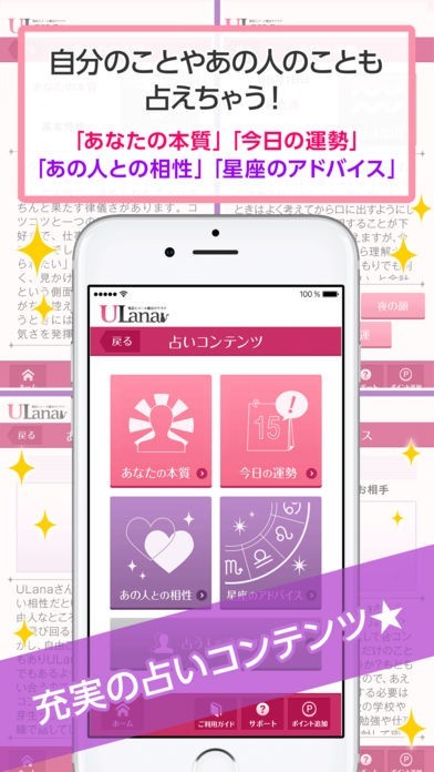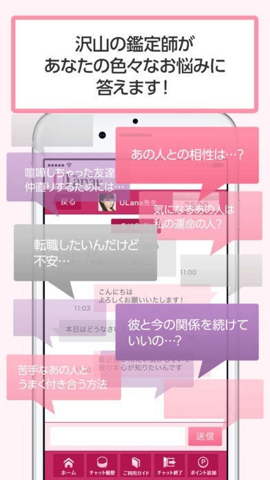 このアプリを使えば、チャットを使って占いで悩みを聞いてもらえるので、忙しいけど悩みを解決してほしいというビジネスマンやの方や子育てをしている主婦の方などをターゲットにしています。 また、気楽に相談することができるので、重い腰を上げる必要がありません。 また、「チャット履歴」から過去の内容を確認できるので、確認して勇気をもらったりできます。 他にも、「今日の運勢」、「あの人との相性」、「あなたの本質」などの占いコンテンツもあるので、毎日確認することによって、その日に気をつけなければならないことを把握できます。 また、このアプリは文字数で課金をするという機能なので、時間を気にして焦ってしまうこともなく、ゆっくりと落ち着いた気持ちで相談できるので安心できます。