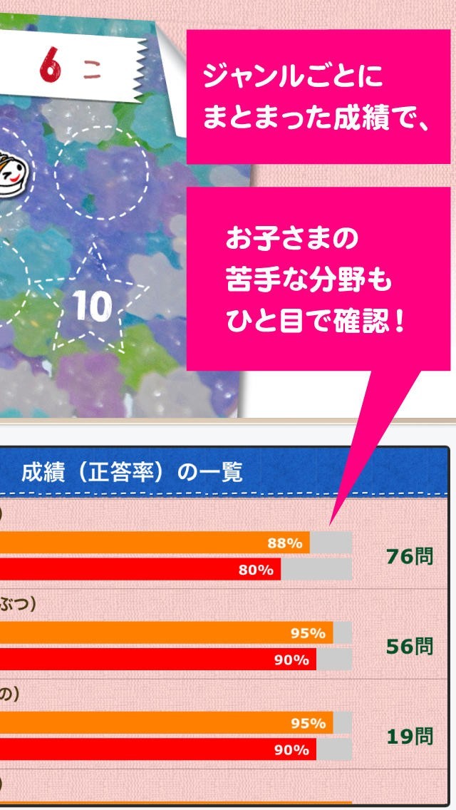小学校入試対策に活躍してくれる「お受験パパのえらぶドリル」では、子供が楽しみながら学ぶための学習機能を充実させています。各問題はイラスト付きで出題。指先で画面をなぞりながら問題に答えたり、図形を描いたりと、実際のノートと同じような感覚で操作できるのが特徴です。シール帳機能も用意。8割以上正解すると可愛いシールが登場し、帳面に貼ることができるため、子供のモチベーション維持に役立ってくれるでしょう。また、成績確認機能も搭載されています。問題パターンごとに正解数などを解析。苦手な分野の把握や、繰り返し学ぶべき問題の絞り込みなど、学習レベルに合わせた勉強を行うためのサポートをしてくれます。