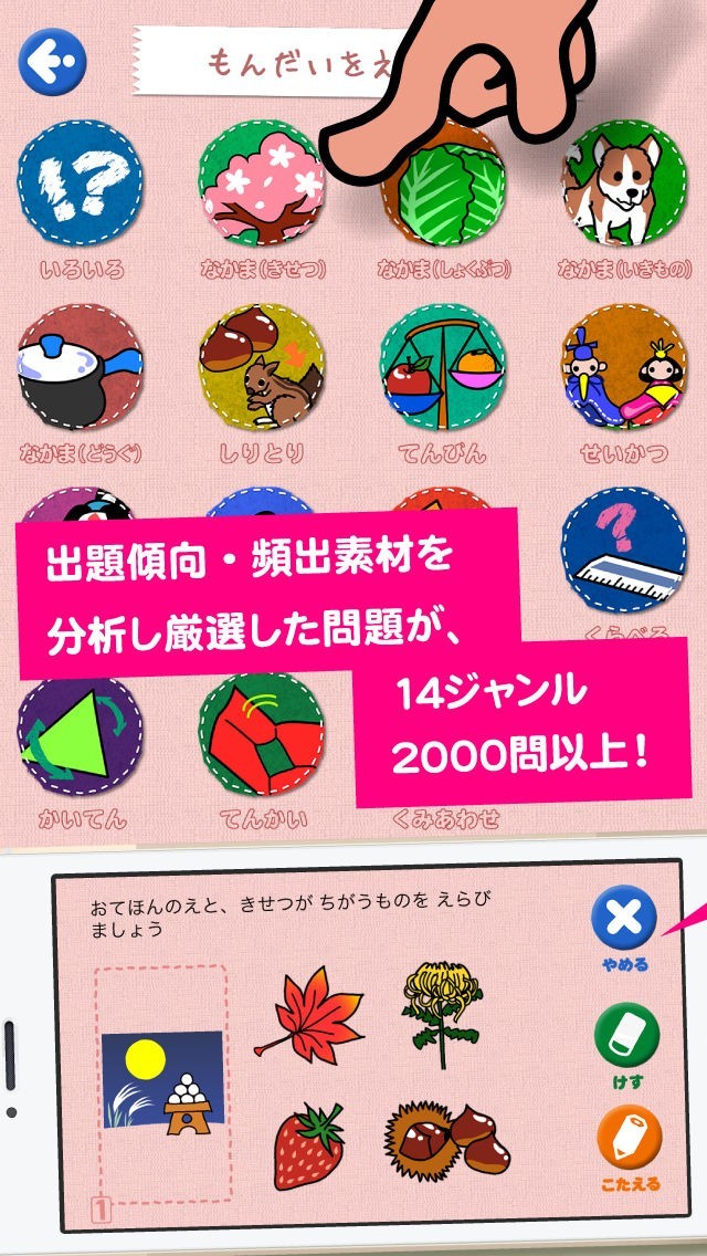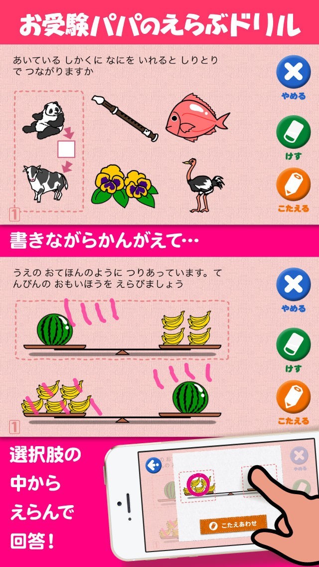 子供のお受験を一緒に成功に導きたいと考えている全国のパパにピッタリのアプリが「お受験パパのえらぶドリル」です。子供たちが楽しみながら勉強を継続するための工夫が詰まっています。例えば、何気ない問題の一つ一つをとっても様々な有名小学校の入試問題を分析した結果であるため、自然と実力が伸ばされます。また、問題のパターンは14種類あり、お子さんの得意な分野から挑戦していくことが大切です。勉強を頑張ればシールがもらえるので続ける意欲が満たされます。
