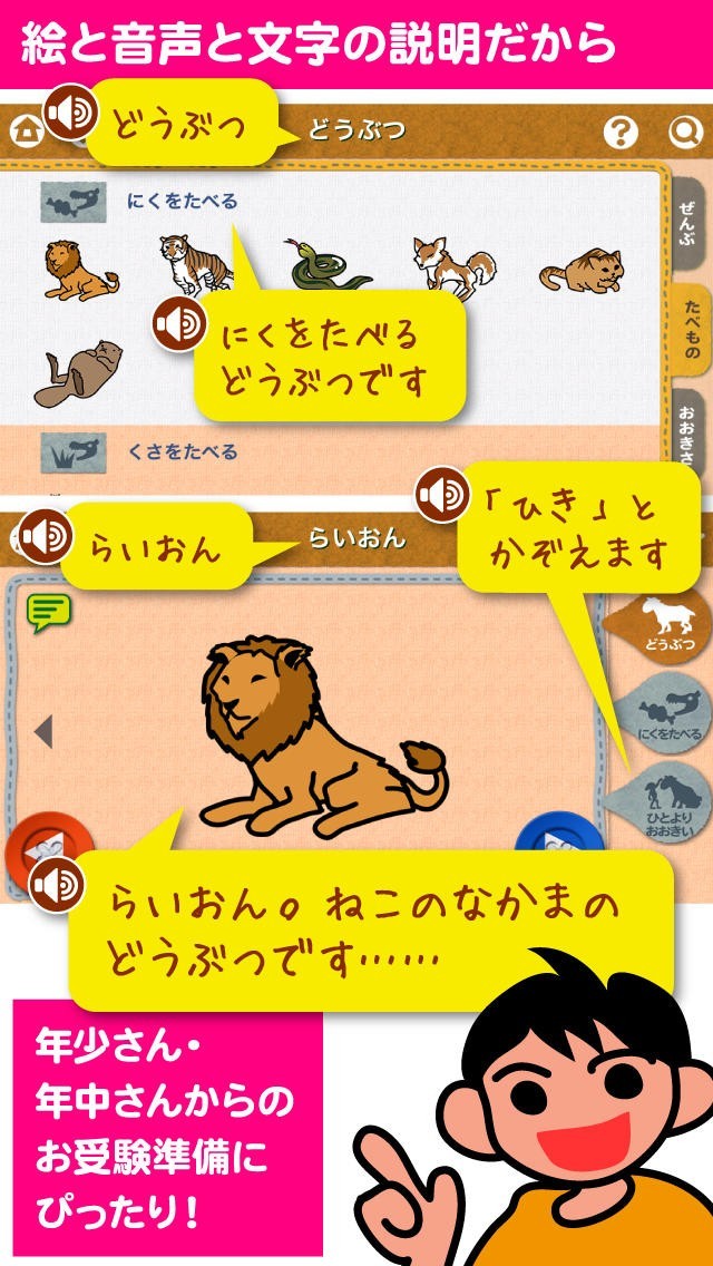絵と文字、音声による説明なので、年中や年少の頃からの利用が効果的!!