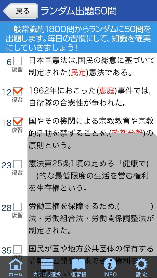 反復学習の定番ツール「赤シート」をアプリで再現。社会・国語・英語・数学・理科・教養・マナーまで、約1700問を赤シートで繰り返し解くことで、一般常識試験に必須の重要知識を確実にインプットできます。
