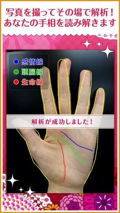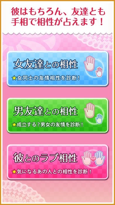 自分の手相はもちろんの事ながら、相手の手のひらの写真を撮れば、友人・恋人は問わず、その人の手相も占うことが出来ます。相性が気になる場合などには役立つ機能となっています。