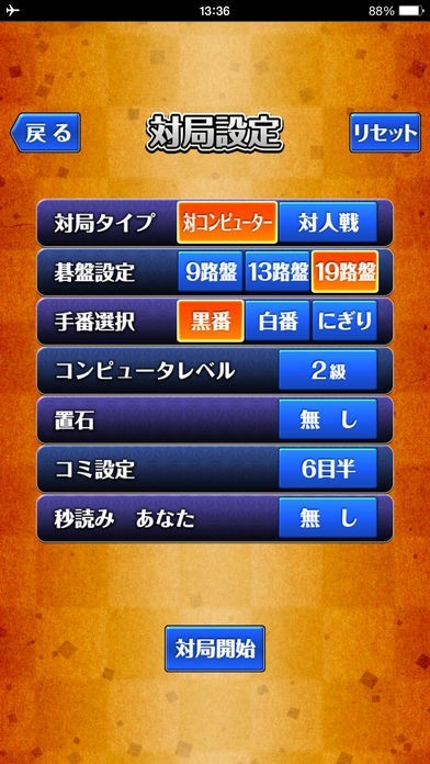 コミや置石などの対局条件を自由に設定することが可能な自由対局モード。