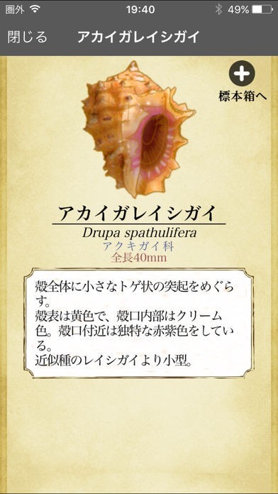 標本箱はマスで区切られた箱のコンテンツで、アプリ内に収録されている貝を自身で選んで保存することが可能です。活用方法もアイデアを活かせることができ、例えば実際に目で見たり触れたりした貝を登録し、記念用としての使用も実現します。