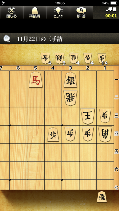 将棋の基本、詰め将棋をマスターして基礎を固めましょう。一手詰、三手詰、五手詰、七手詰の問題が毎日出されます。数をこなせば、あなたの終盤力は大きく向上するはずです。
