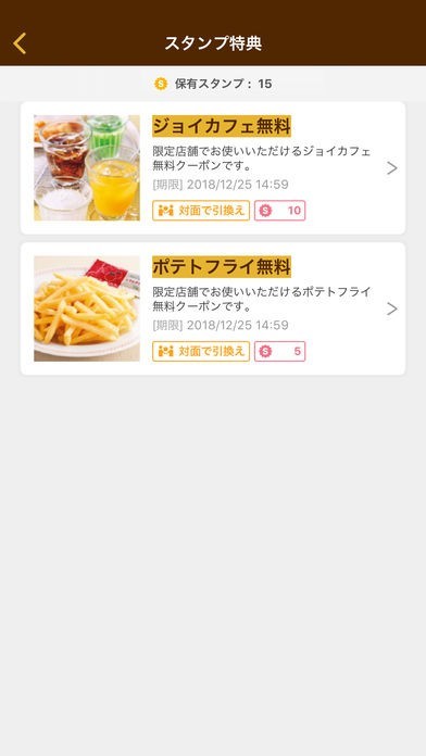来店のたびに来店ポイントが貯まります!5ポイント毎に人気の「ポテトフライ」または「ジョイカフェ」が無料でご注文いただけます。