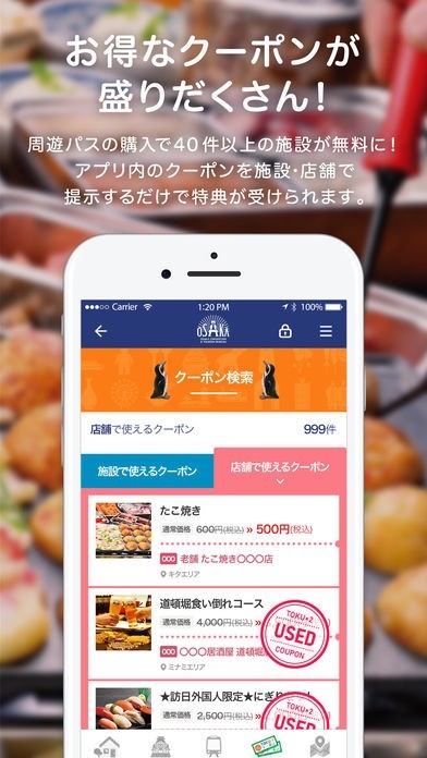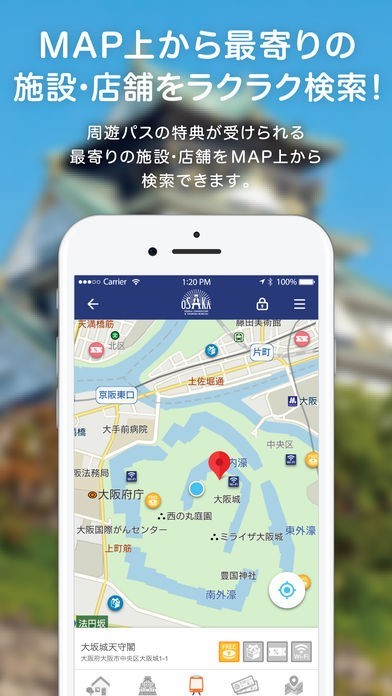 また、現在地のMAPから周辺の施設が確認でき、さらに、大阪周遊パスを購入された方は、乗車券バーコードを登録することで、目的地までの経路検索やお得な店舗では割引等クーポンを使用することができます。