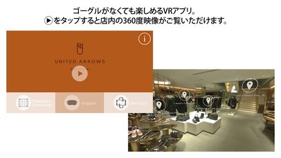セレクトショップのUNITED ARROWS 六本木ヒルズ店にこれから行く予定を立てている方や遠くに住んでいるので気軽にお店に行くことができないと言う方に使用していただきたいアプリです。このアプリは2016年9月にリニューアルオープンしたお店の雰囲気をVR映像でバーチャル体験できるようになっていて、VRゴーグルがあるとより一層の臨場感が感じられますがゴーグルが無くても見ることができます。操作方法も簡単でホットスポットをカーソルやタップすると別窓表示され、リンクを選択すると次の画面に移動できます。店内が広いため一度VR映像で店内の下見をしてから訪れてはいかがでしょうか。