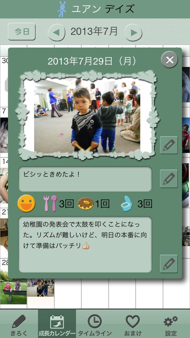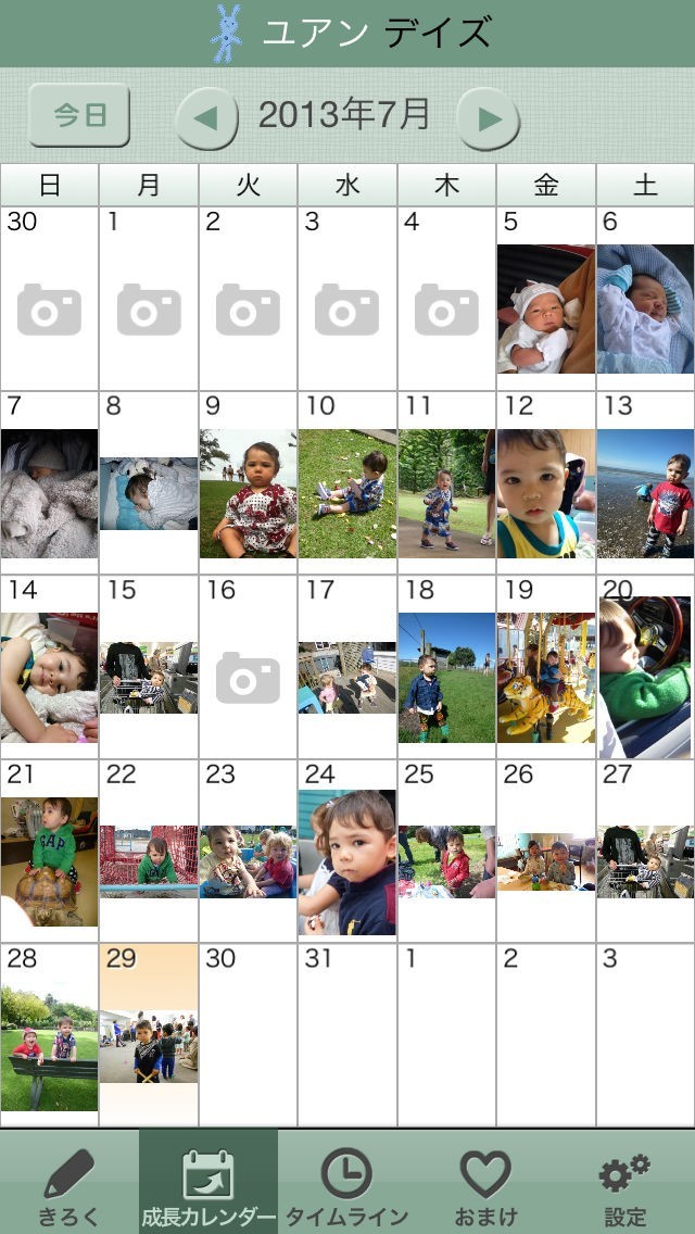 成長カレンダーは日付をタップするだけで写真の追加も可能。タイトルやメモも添付できる!