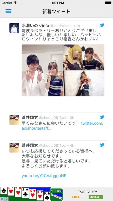 アニメや映画の吹き替えに命を吹き込む、「声優」という存在。 凄まじい人数がいて、ブログやTwitterをやっている声優さんも非常に多いです。 このアプリは、手軽に400人以上の声優さんの中から、自分の興味のある声優さんを抽出することができます。 自分で選ぶことができるんで、自分オリジナルのブログとTwitterの新着フィードを作ることが可能です。 後者のTwitterに関しては、アカウントを所持していなくても閲覧可能なため、わざわざ手間をかけてアカウント作成をする必要もありません。