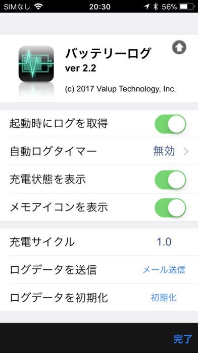 ・設定画面にて、充電サイクル(累積100%を1としたもの)を確認できます。