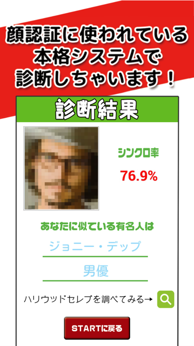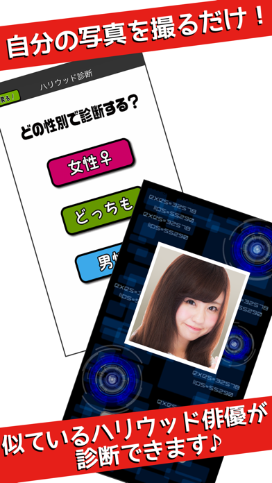 「ハリウッド顔診断」は自分の顔がハリウッド俳優の中でだれに似ているのかを自動的診断してくれる顔診断アプリになります。使い方はアプリを起動して顔写真を撮影するか、カメラロール内に保存している写真の中から診断したい写真を選択するだけで、あとは本人確認のセキュリティなどにも使用される高精度な顔認証システムで似ているハリウッド俳優を教えてくれます。似ている俳優を表示するだけでなく、どのくらい似ているかシンクロ率で表示してくれます。