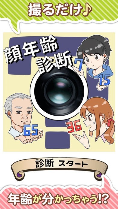 「顔年齢診断」ではスマホで撮影した顔写真にて見た目年齢を診断することが可能です。 スマホに保存してある写真、またはカメラで写真を撮影する、どちらか選べます。 見た目年齢と実年齢と人によっては差が出ることがありました。 ある程度年齢を重ねてくると、男性でも女性でも実年齢より若く見られたいものです。 そんな時の見た目年齢の診断に使えます。 自分でもお友だちでも家族でも、顔写真があれば診断できます。 見た目年齢と一緒にスマイル度も表示させることが可能です。 診断結果はシェアすることも可能、ネタにしたい時にも便利です。
