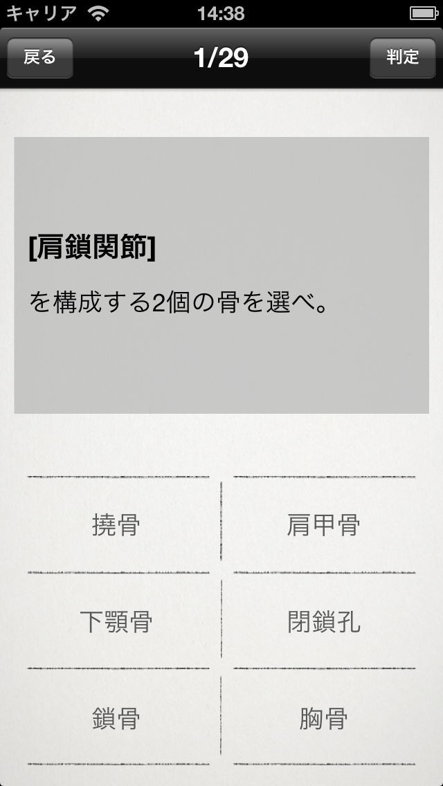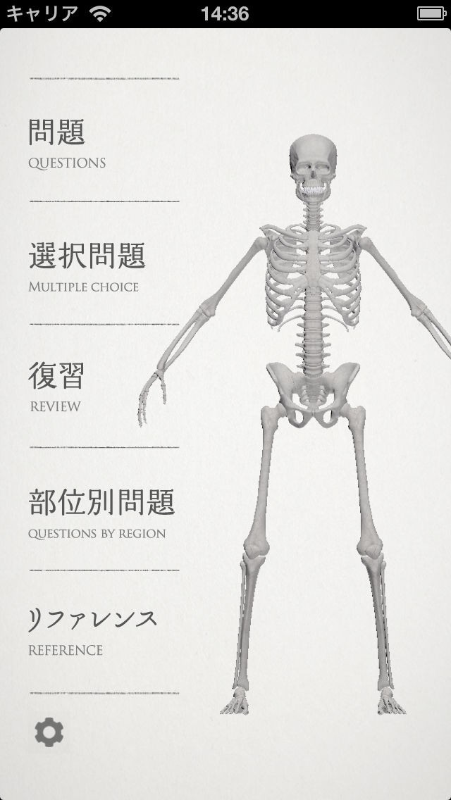アプリでは解剖学に関するクイズが文章問題、選択問題として出題されます。正答のタッチ、画像の選択などで答えられます。骨への理解が深まるだけではなく医療分野の知識を学ぶ時にも使用できます。