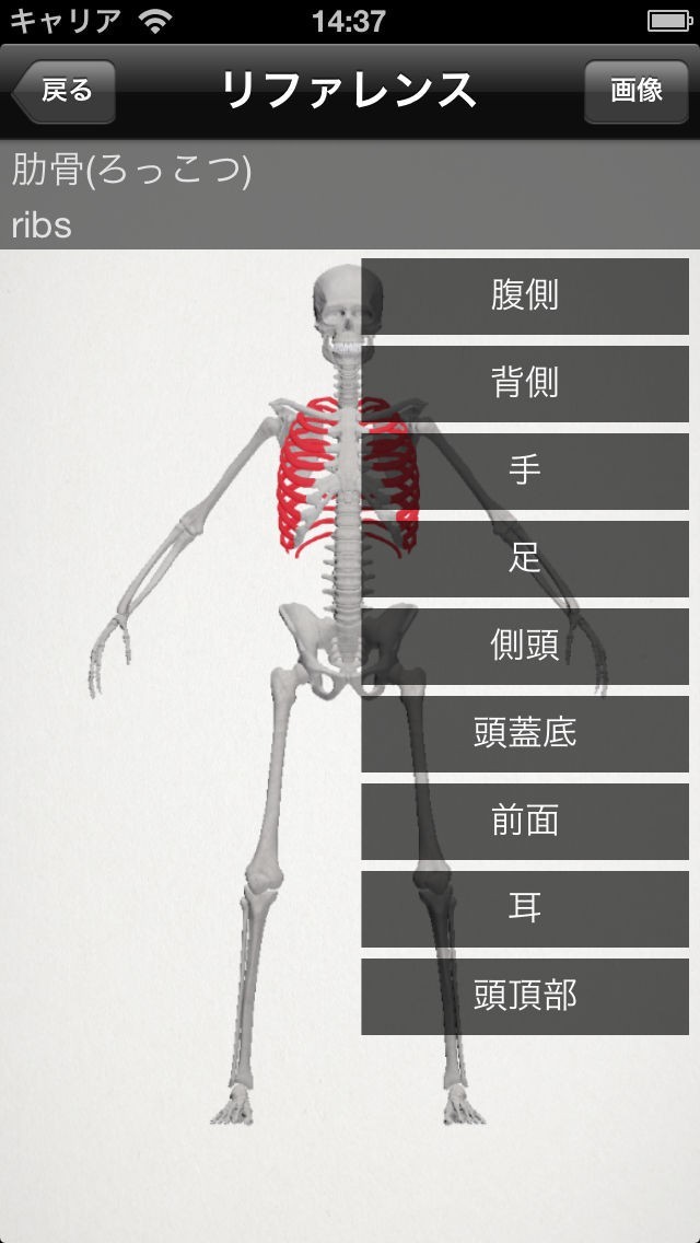リファレンスの項目ではも骨のパーツを骨格標本の画像から正確な名称を調べることができます。逆に名前からの検索でパーツ部分を表示することも可能です。図鑑としても活用できます。
