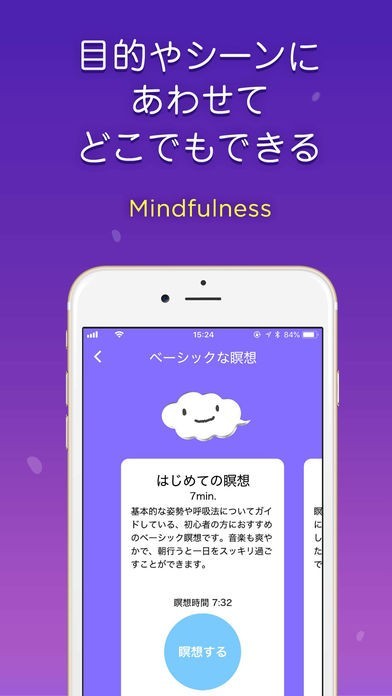 瞑想を始めたいけれどどうやってやったら良いかわからない!という人にオススメのアプリです。 やり方がわからなくても呼吸法などをナビゲート付きで進められるので気軽に瞑想できます。 シーン選択も様々で、「自信をつけたい時」「お昼寝の時」などバリエーション豊かに選べます。 聴いているだけでOKなので、通勤時間や休憩時間などの少しの隙間時間を有効に使えます。