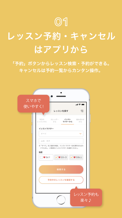 「予約」ボタンからレッスン検索・予約ができる。キャンセルは予約一覧からカンタン操作。アプリなら、より使いやすく探しやすい!
