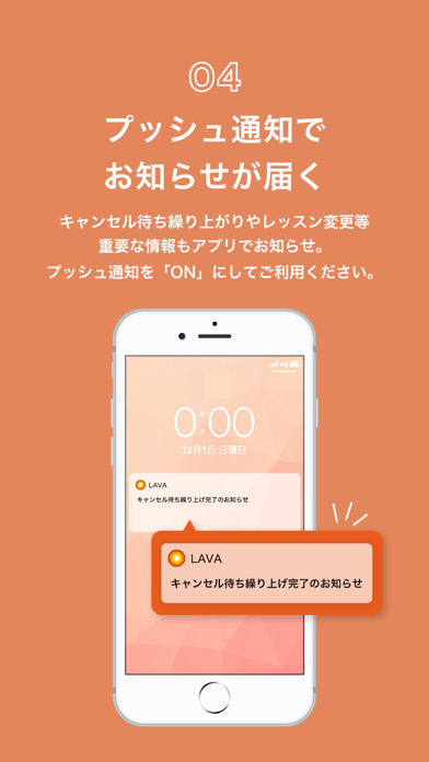 キャンセル待ち繰り上がりやレッスン変更など、重要な情報もアプリでお知らせ。プッシュ通知を「ON」にしてご利用ください。