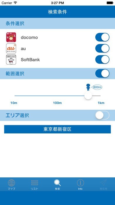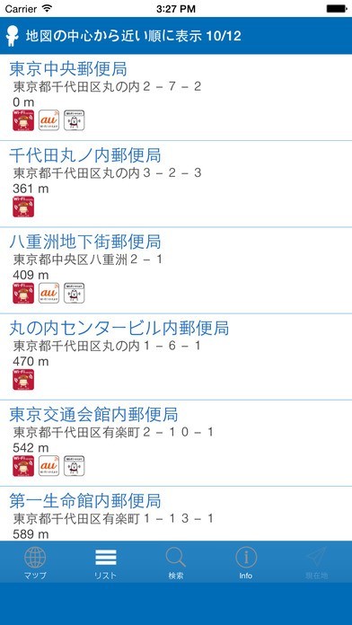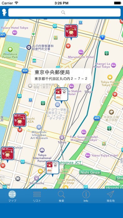 スマホやタブレットでネット回線を契約している方にとって問題となるのが通信制限です。そこで、街中で無料で使えるWi-Fiスポットを探すことができれば非常に便利だという考えに基づいて作られたアプリがきたさんのWi-Fi検索です。最寄りの郵便局にあるWi-Fiスポットを見つけることができます。地図上に場所が表示されるので移動経路が非常にわかりやすくなっています。また、検索条件からはWi-Fiスポットまでの距離や利用可能なキャリアなどを設定できます。