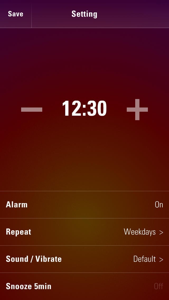 より細かい設定をしたい場合はアラームをタップして下さい。設定画面では分刻みの時間調整やリピート、スヌーズ、アラーム音の設定が可能です。アラーム音を変えるとアイコンの形や動きも変わります。