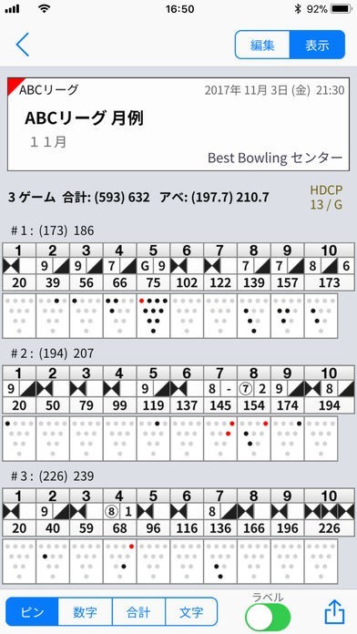 ボウリング場の雰囲気さながらのマークをすることが可能となっております。2投目の残りピンの配置や、ストライクマークやスプリットなどの表記もリアルに表現されています。