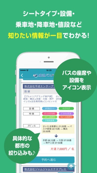 コンセント付きや3列シート、最安値など希望する条件から高速バスを検索・予約することが出来ます。快適に高速バスを利用したい、安く高速バスを利用したいという人におすすめのアプリです。