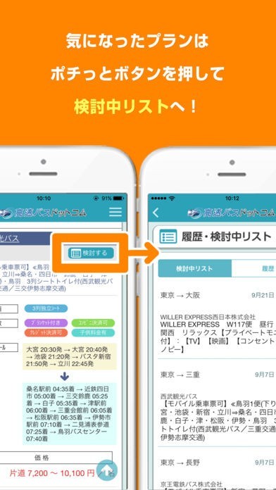 シートタイプや設備、価格などが一目で分かるように表示する機能を搭載。気になったプランは検討中リストに登録しておくことでいつでも見直すことが可能です。ポイント機能もあるので2回目以降はさらにお徳に利用できます。