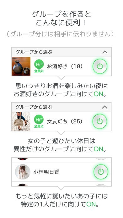 「ON - あなたのヒマをシェアするアプリ。」には、友達リストを登録しておくと暇になった時に手軽にコミュニケーションできる機能が搭載されています。暇になった時は、アプリをONにすることで暇であることが周りに分かります。友達リストはグループ分け機能で自分の好きなように設定ができます。グループ分けをしていることは友達には伝わりませんが、グループを分けることでグループ全体に向けて暇な時にお知らせできます。外出して遊びたい時はこのグループ、仲良しだけで集まりたい時はこのグループなど自分だけの設定が可能です。また友達リスト機能では個別に状態をチェックできます。ONになっている友達にHiを送ることで、メッセージを送ることなく気軽に暇であることをお知らせできます。