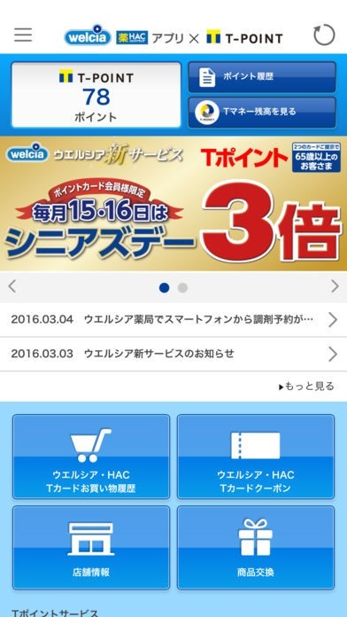 Tポイント数が確認出来たり、ウエルシアのキャンペーン情報を知ることが出来てお得です。
