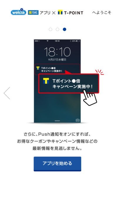 ウェルシアグループ×Tポイントアプリのプッシュ機能をオンにすると、お得なクーポン情報の通知を受け取る事が出来ます。アプリを開かなくても、お得な情報を得られます。