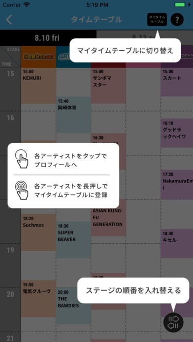 マイタイムテーブル機能で自分が見たいアーティストのライブなどを登録することで予定を立てることができるようになっていて、SNSでシェアすることも可能となっています。