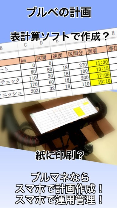 ブルマネではキューシートに従いPCやフィニッシュポイントを入力し計画を作成します。各PCへの到着/出発時間を移動速度と滞在時間から計算し、最終的にフィニッシュポイントの到着時間を計算します。