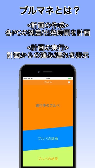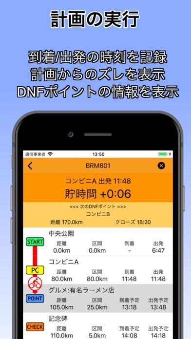 作成した計画は実行することができます。実行モードではアプリ内のボタンをタップし、到着時間、出発時間を記録します。記録された時間から、計画からのズレを算出し、時間的な遅れ/進みを「貯時間」という数値で示します。