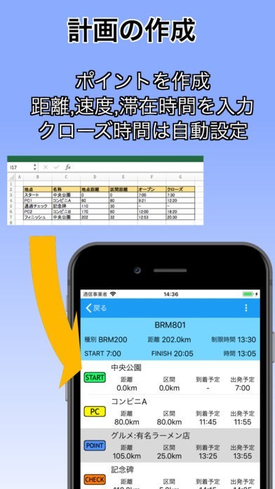 各PCの到着時間は、区間距離と移動速度から算出し、出発時間は到着時間に滞在時間を加算して算出します。この計算をフィニッシュポイントまで積み上げ、トータルの時間を算出するのがブルマネでの基本ロジックです。