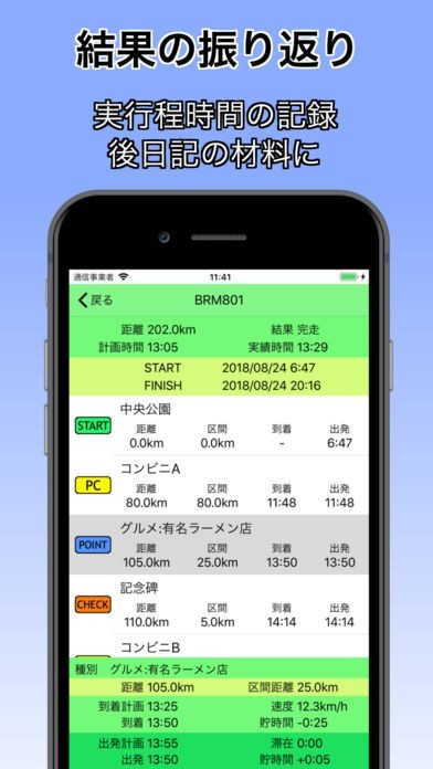 実行された計画は、最終的にフィニッシュポイントに到着するか、強制的に終了させる事で結果一覧に表示されます。ブルベ後に結果を見る事で、各ポイントの到着時刻、出発時刻、移動速度、滞在時間、貯時間を確認する事ができます。後日記を作成する際の情報や、また次回以降のブルベ計画時の移動速度の設定に役立てることができます。