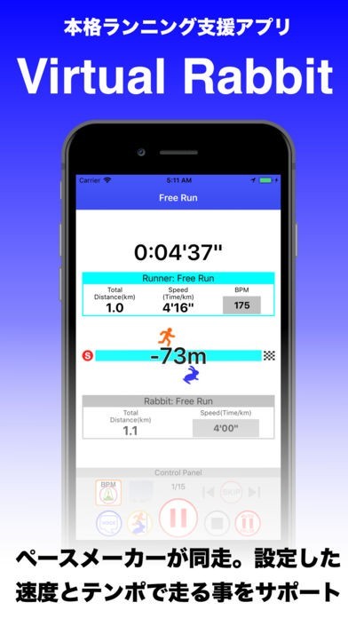 「Virtual Rabbit」は、ランニングをサポートしてくれるペースメーカーアプリです。 使いやすいペースメーカー機能を搭載しており、お好みのテンポでメトロノーム音や音楽の再生が可能。 「ラビット」と呼ばれる仮想ペースメーカー機能を搭載しているのも便利なポイント。 設定タイム通りにラビットが走り、距離差を定期的に教えてくれるため、ラビットに合わせて走ることで目標タイムを達成できます。