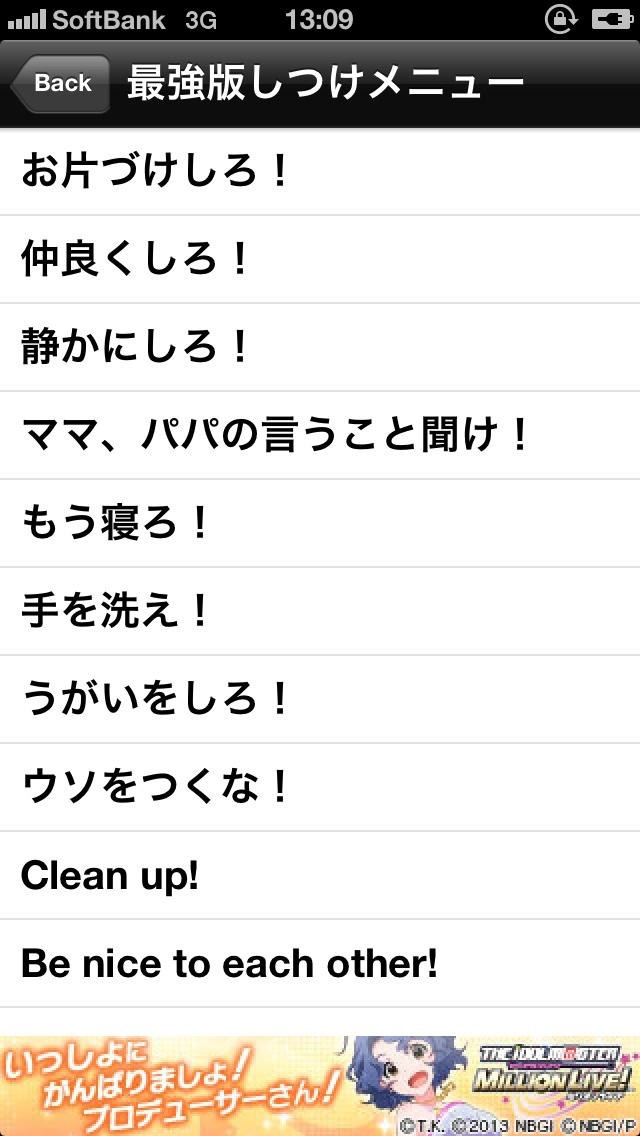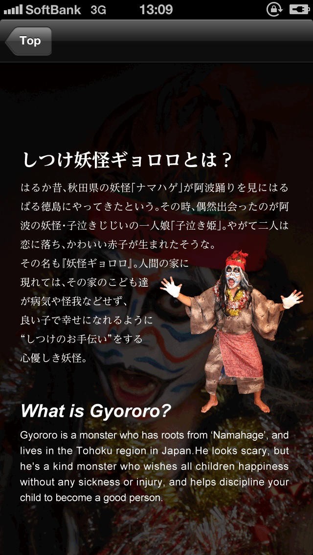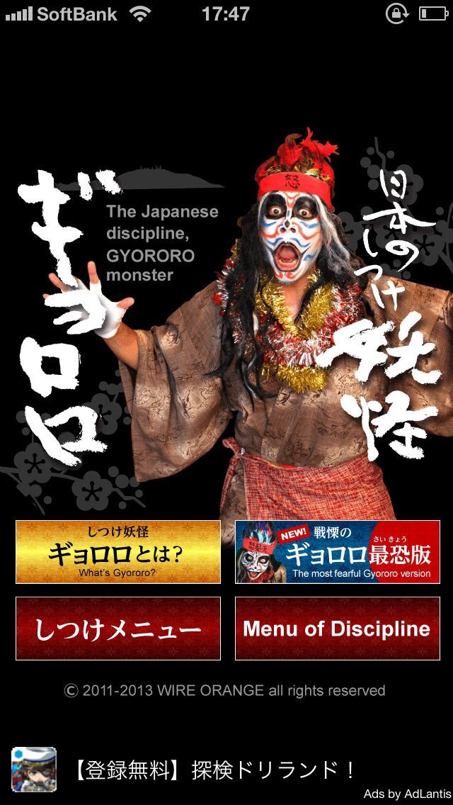App Storeより引用「仲良くしなさい」や「お片付けしなさい」などのしつけメニューボタンを押すと、“しつけ妖怪ギョロロ”が現れて、しつけのお手伝いをしてくれるアプリケーションです。