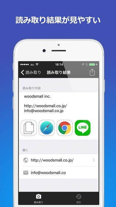 このアプリでは、読み取ったQRコードの情報をすばやくSafari、Google Chromeなどで検索できるだけでなく、メールやLINEなどのSNSで送信することもできます。