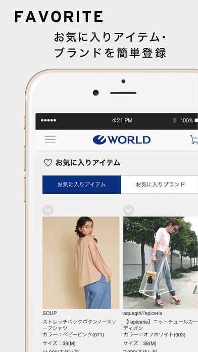アイテム検索機能が搭載されており、カラーやサイズを指定して探すことが可能です。気になったものはお気に入りリストに登録できるので、いつでも後でチェックすることができます。