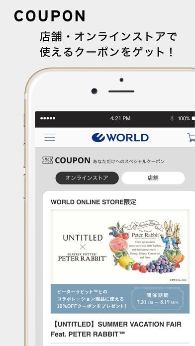 アンタイトルやタケオキクチなどの人気ブランド店約2400店舗で使えるファッションアプリになっております。ポイントカードとしての機能も有しており、購入の際に提示することで次回から使えるポイントが貯まります。またサイズや色味を絞って検索することもできます。他にもお気に入りのブランドを登録しておくことで、新着の商品が入るとアプリでチェックできます。