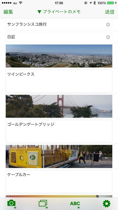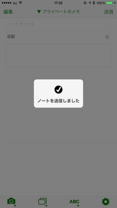 Evernoteに、写真を入れたテキストを送信することができます。写真はカメラロールから複数選択し、一気に追加するのことができるので手間なく使いやすい設計になっています。