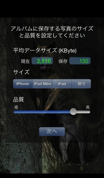 写真のデータサイズや品質を細かく設定することが出来る