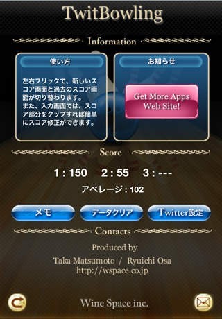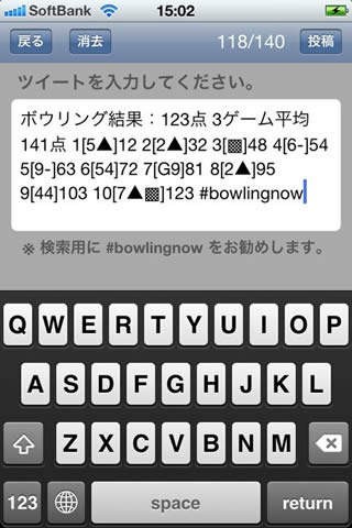 共有機能があり、ゲームのスコア状況をツイッターなどで投稿して、自分の記録を自慢する楽しみ方もあります。左右のフリックで新しい画面と過去の画面切り替えて比較したり、今日の調子がわかったりとボウリングの練習に役立ちます。
